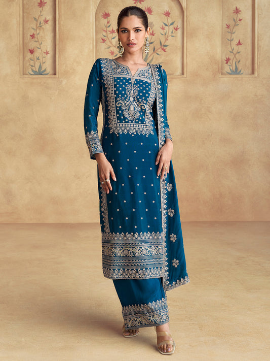 Chinon Festive Readymade Salwar Kameez in Blue with Zari work-750061