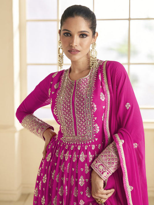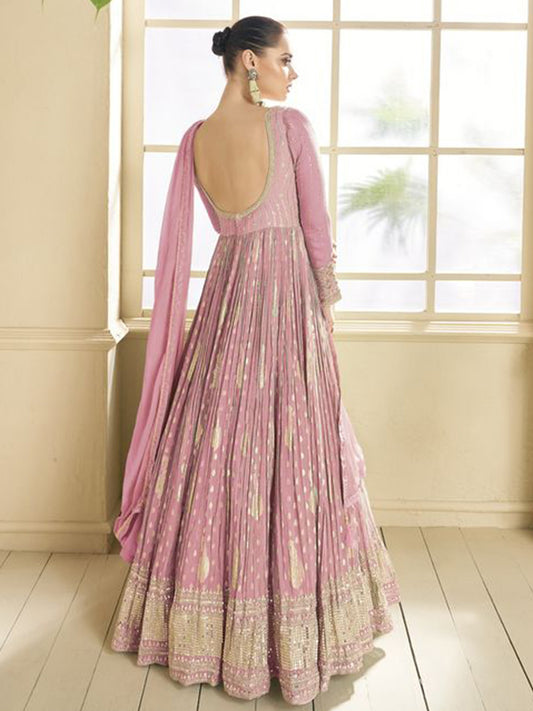 Silk Jacquard Festive Semi Stitched Gown in Pink with Zari work-750064
