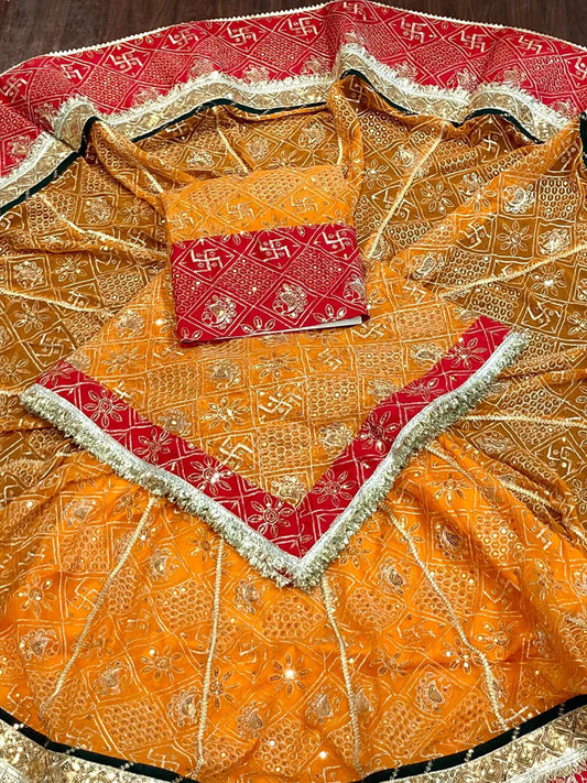 Designer Gorgette 13 meter full Gher Premium quality Stitched Rajasthani Lehenga Choli in red and Green color-91347