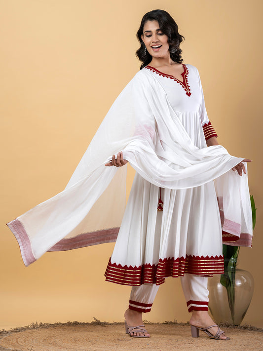 Maroon White Anarkali Premium Rayon Kurta Pant Set with Cotton Dupatta–3 Piece Ready to Wear Salwar Kameez Suit Set-750124