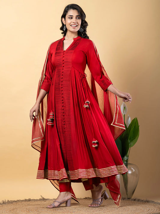 Red Anarkali Premium Rayon Kurta Pant Set with Cotton Dupatta Designer–3 Piece Ready to Wear Salwar Kameez Suit Set-750151
