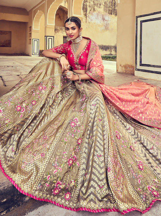 Embroidered Silk Jacquard Wedding Lehenga in Gray and Gold