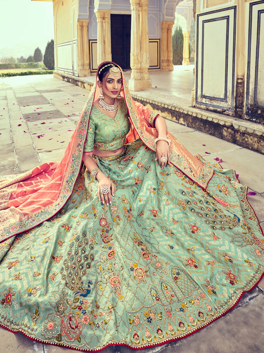 Embroidered Silk Jacquard Wedding Lehenga in Green