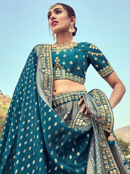 Embroidered Silk Jacquard Wedding Lehenga in Blue