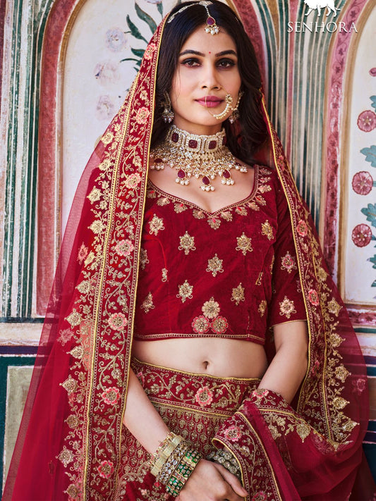 Stone Velvet Bridal Wedding Lehenga in Red and Pink