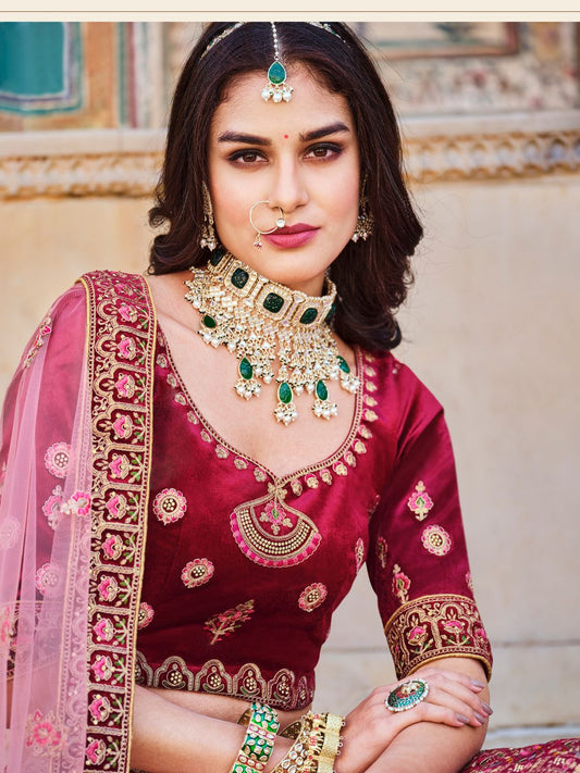 Stone Velvet Bridal Wedding Lehenga in Maroon