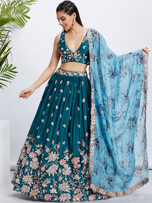 Polyester Chiffon Semi-Stitched Reception Lehenga Choli In Blue color-40974
