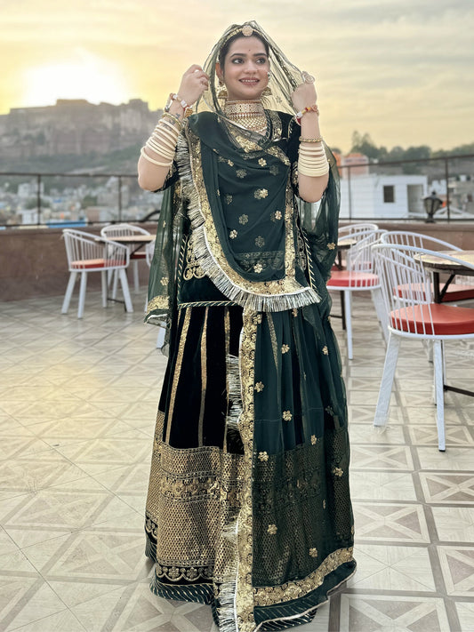 Velvet wedding Sangeet Sequence work Rajputi Poshak In Green Color