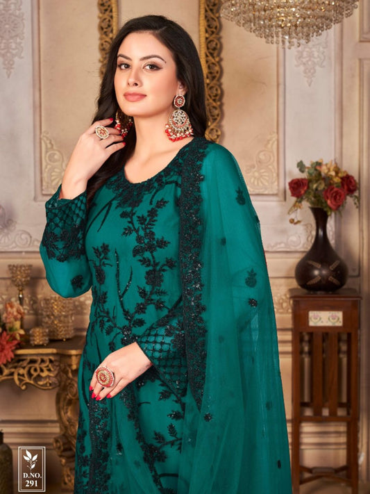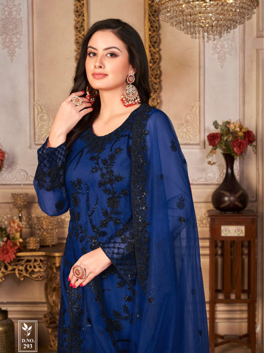 Embroidered Net Mehendi Sangeet Suits in Blue