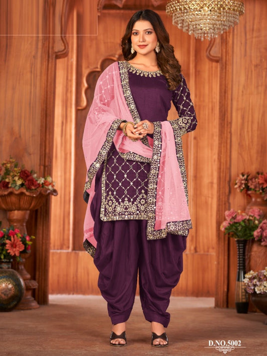 Mirror Art Silk Patiala Salwar Suit in Purple