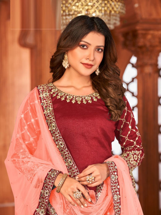 Mirror Art Silk Patiala Salwar Suit in Maroon