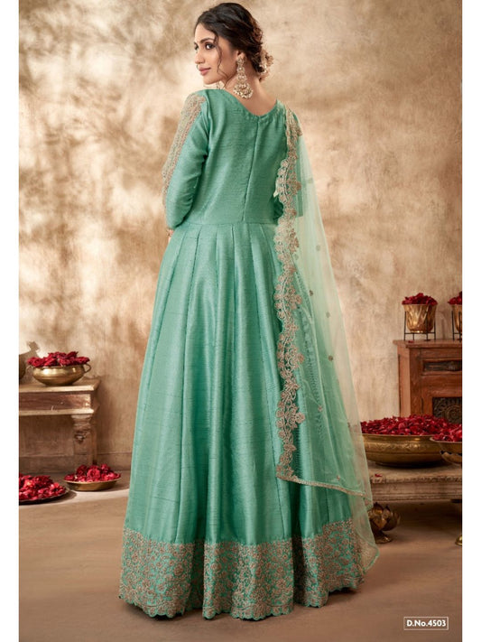 Embroidered Silk Mehendi Sangeet Gown in Green