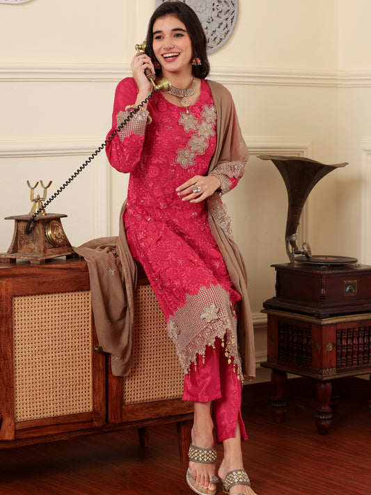 Resham Zari Georgette India Suit in Pink & Dupatta Set-750038