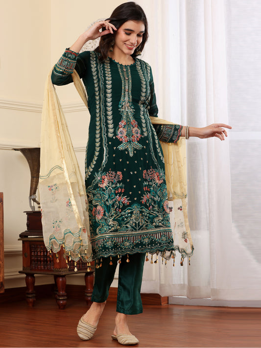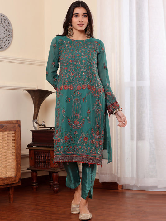 Resham Zari Georgette India Suit in Green & Dupatta Set-750036