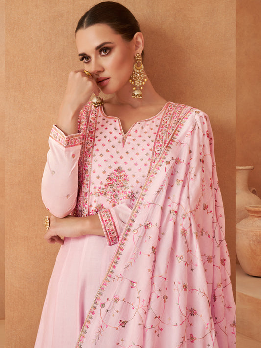 Embroidered Silk Free Size Stitched Flor lenght Salwar Kameez in Pink Color-81595