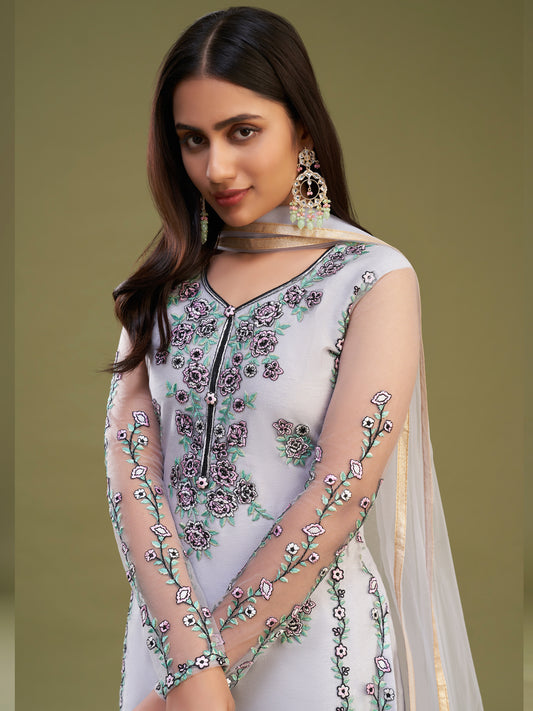 Thread Embroidered Banglori Silk and Net Salwar Kameez in White Color-81598