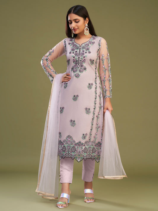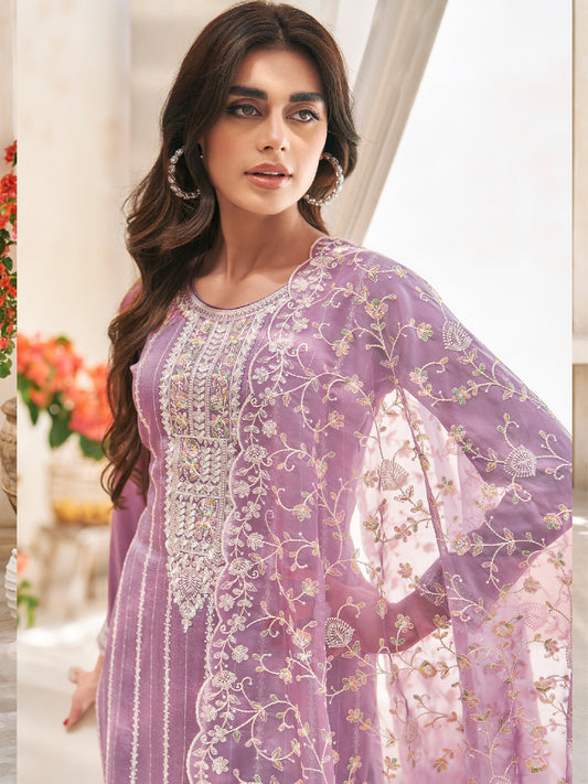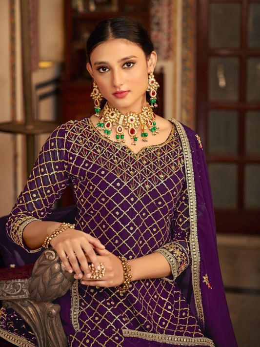 Embroidered Chinon Semi Stitched Gharara style Salwar Kameez in Purple Color-81561