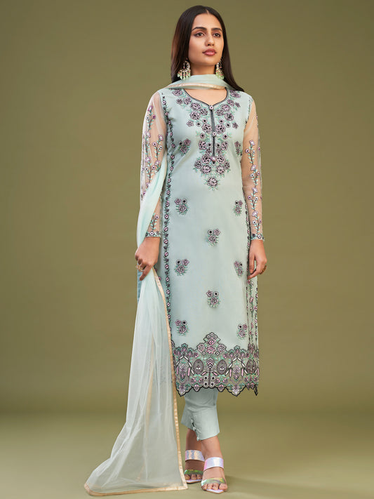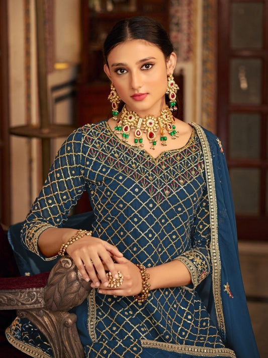 Embroidered Chinon Semi Stitched Gharara style Salwar Kameez in Blue Color-81562