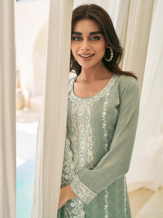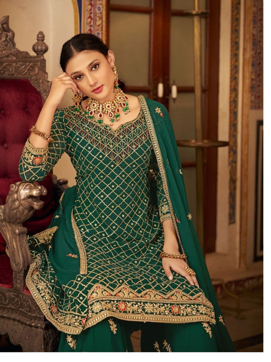 Embroidered Chinon Semi Stitched Gharara style Salwar Kameez in Green Color-81560