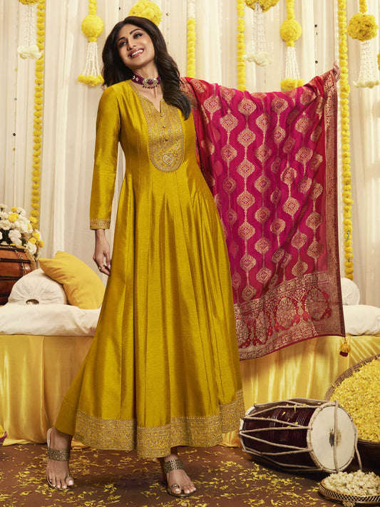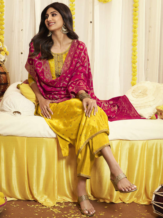 Meena Work Pure Viscose Dola Jacquard Hald and Sangeet Salwar Kameez in Yellow Color-81602