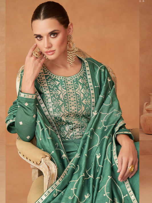 Embroidered Silk Un-Stitched Salwar Kameez in Green Color-81593