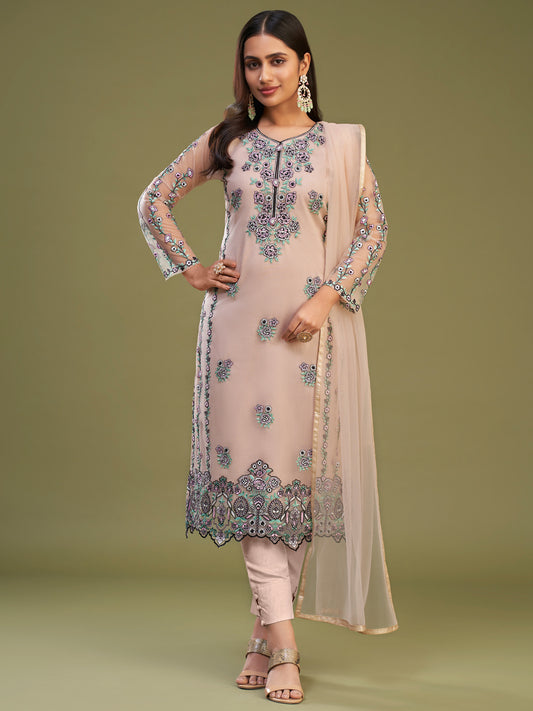 Thread Embroidered Banglori Silk and Net Salwar Kameez in Peach Color-81599