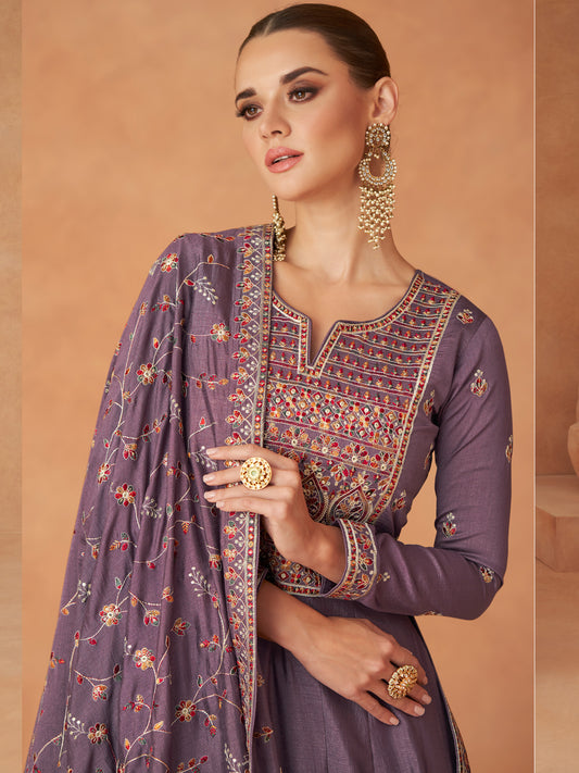 Embroidered Silk Free Size Stitched Flor length Salwar Kameez in Purple Color-81597