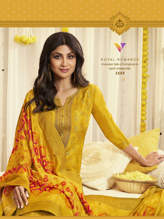 Meena Work Pure Viscose Dola Jacquard Hald and Sangeet Salwar Kameez in Yellow Color-81603