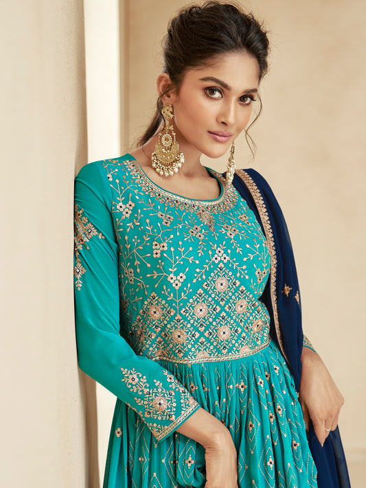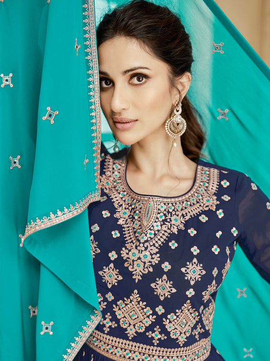 Embroidered Georgette Free Size Sharara style Salwar Kameez in Blue Color-71047