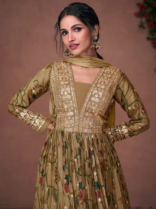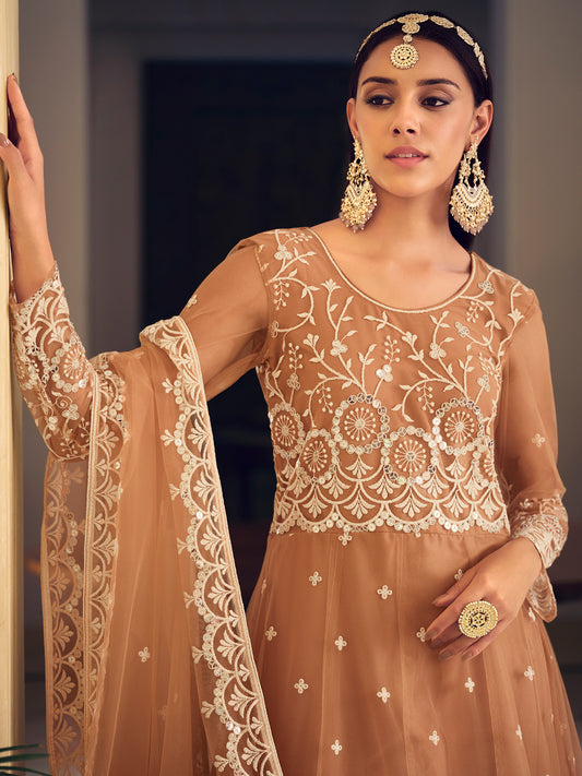 Embroidered Net Bollywood Floor Length Semi Stitched Salwar Kameez in Beige-81345