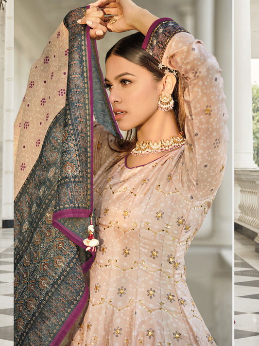 Jacquard And Bandhani Print Dolla Silk Gown style Salwar Kameez in Cream and Pink Color-81354