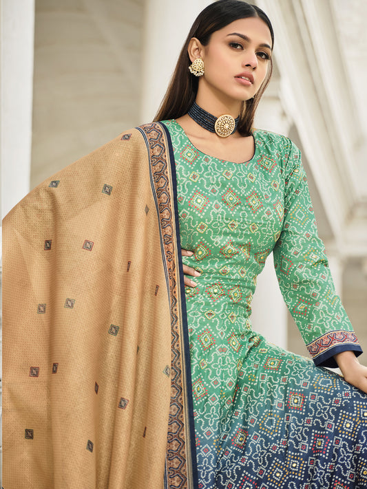 Jacquard And Bandhani Print Dolla Silk Gown style Salwar Kameez in Green Color-81355