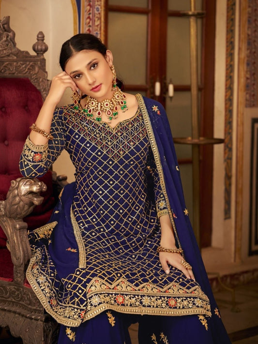 Embroidered Chinon Semi Stitched Gharara style Salwar Kameez in Blue Color-81559