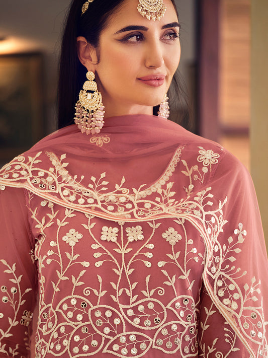 Embroidered Net Bollywood Floor Length Semi Stitched Salwar Kameez in Pink Color-81347