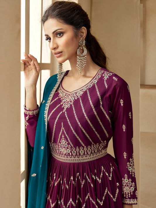 Jacquard And Bandhani Print Dolla Silk Gown style Salwar Kameez in Blue and Purple Color-81357