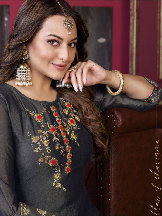 Sonakshi Sinha Bollywood Embroidered Silk Pakistani Style Salwar Kameez in Grey Color-71039