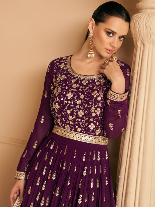Embroidered Chinnon Free Size Plazzo style Salwar Kameez in Purple Color-71021