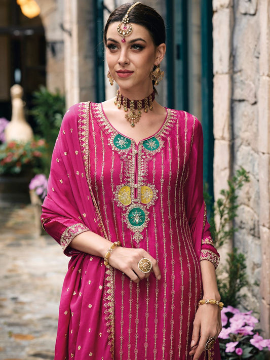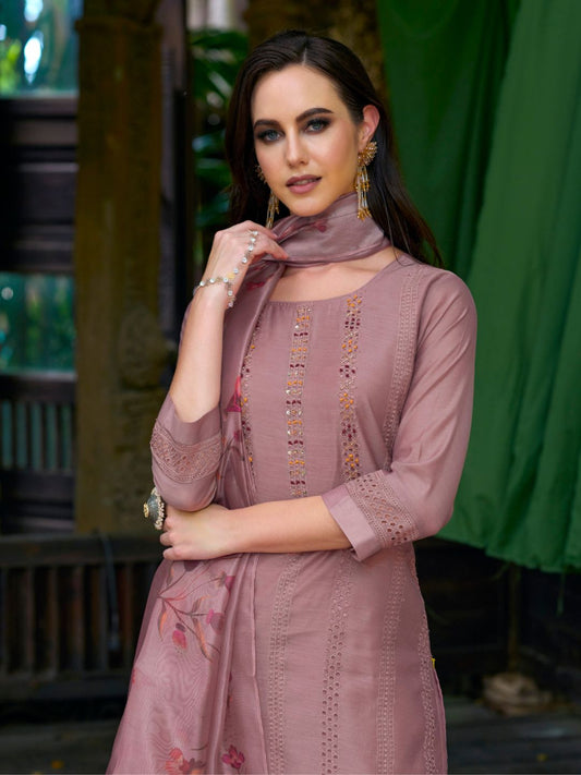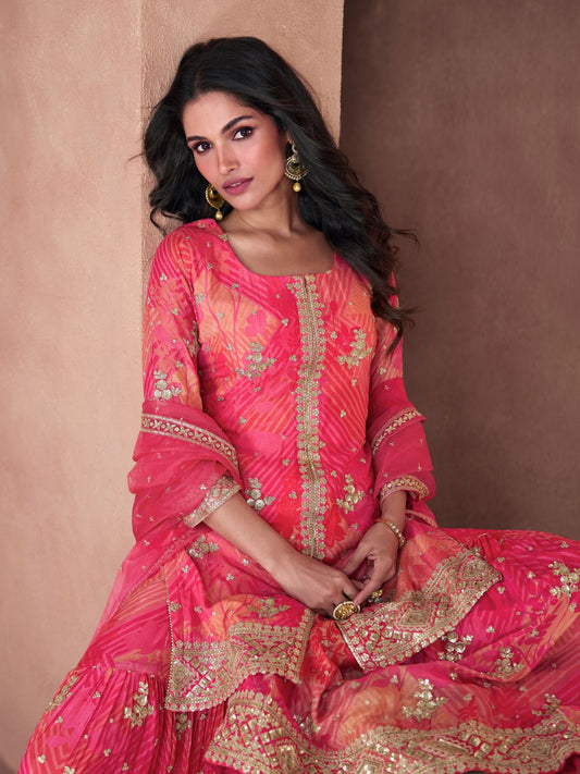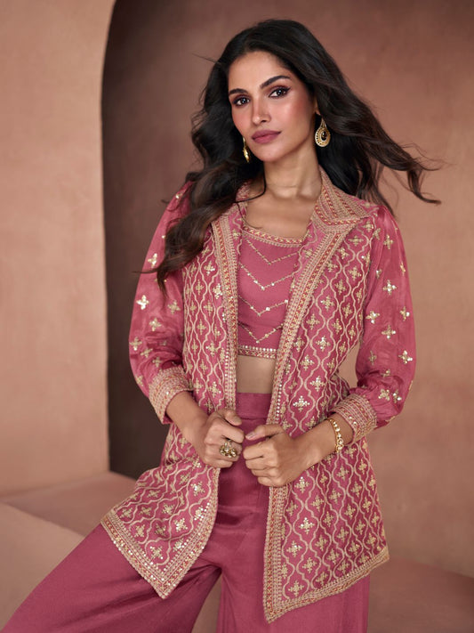 Embroidered Chinnon Free Size Plazzo style Salwar Kameez in Pink-71018