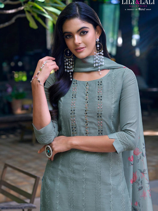 Printed Chanderi Silk Pakistani style Salwar Kameez in Grey Color-71029