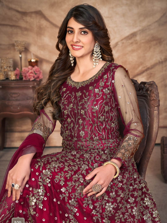 Embroidered Net Partywear Salwar Kameez in Maroon Color-71013
