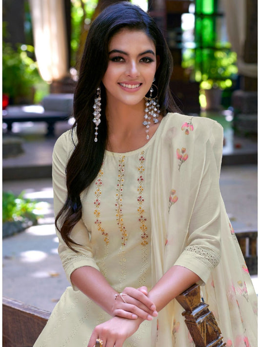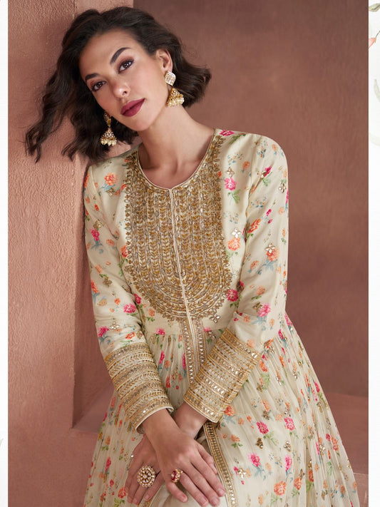 Printed Chanderi Silk Pakistani style Salwar Kameez in Cream Color-71030