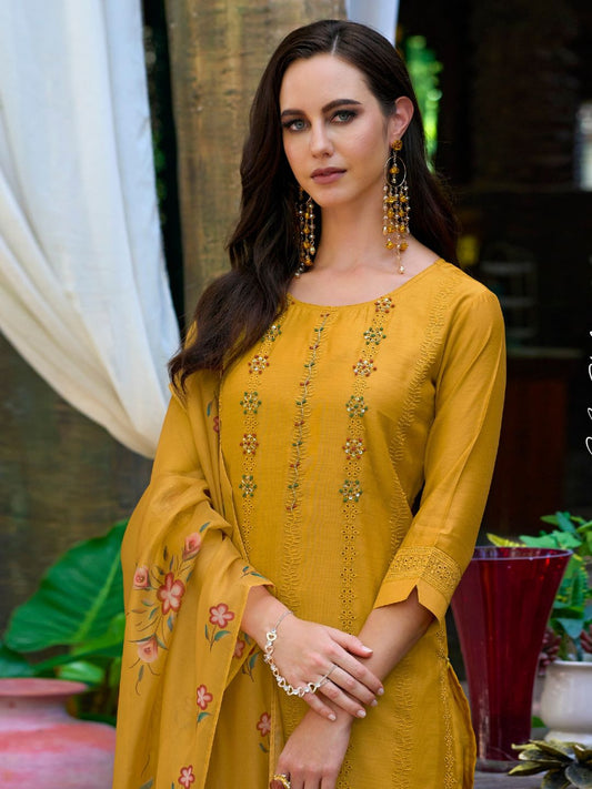 Printed Chanderi Silk Pakistani style Salwar Kameez in Yellow Color-71026