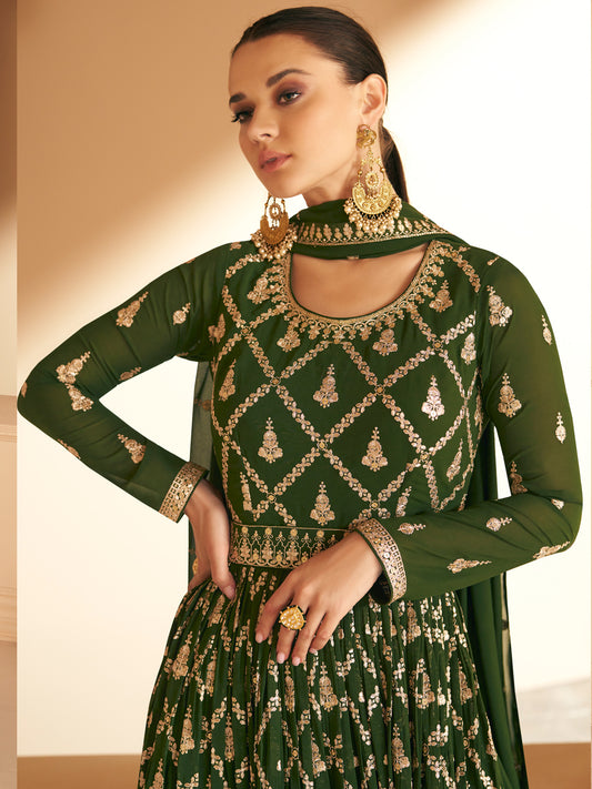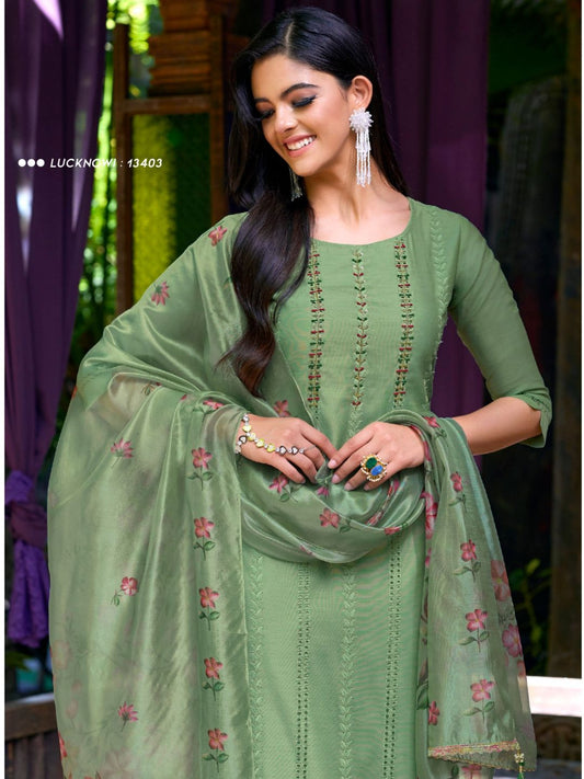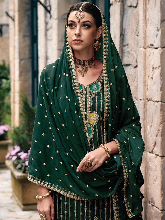Embroidered Chinnon Free Size Plazzo style Salwar Kameez in Green Color-71019