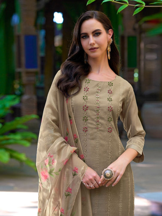 Printed Chanderi Silk Pakistani style Salwar Kameez in Beige Color-71027