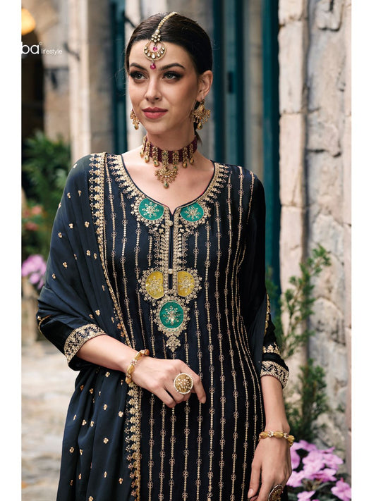 Embroidered Chinnon Free Size Plazzo style Salwar Kameez in Grey Color-71020