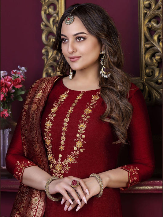 Sonakshi Sinha Bollywood Embroidered Silk Pakistani Style Salwar Kameez in Red Color-71036