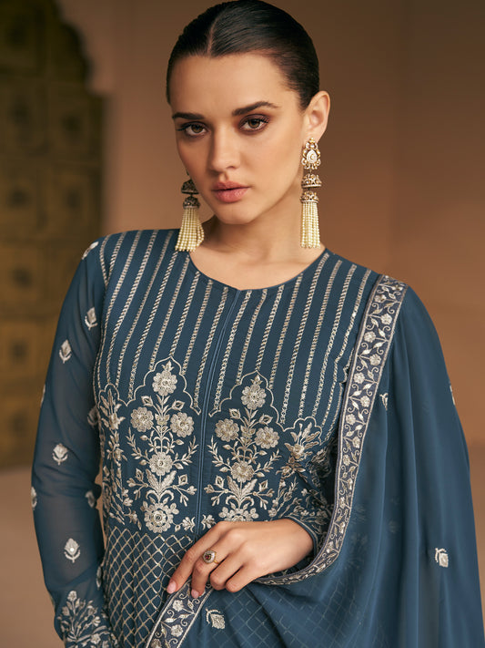 Embroidered Georgette Free Size Salwar Kameez in Light Blue Color-71023