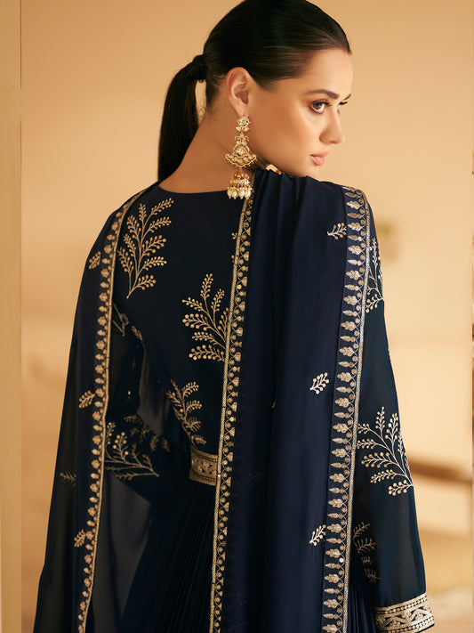Embroidered Georgette Free Size Salwar Kameez in Navy Blue Color-71025