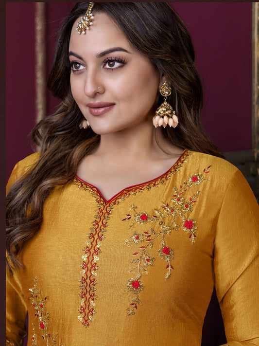 Sonakshi Sinha Bollywood Embroidered Silk Pakistani Style Salwar Kameez in Yellow Color-71032