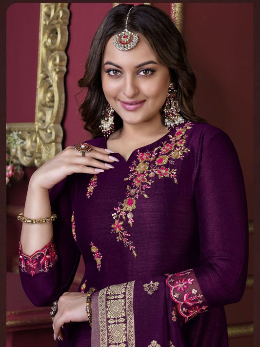 Sonakshi Sinha Bollywood Embroidered Silk Pakistani Style Salwar Kameez in Purple Color-71033